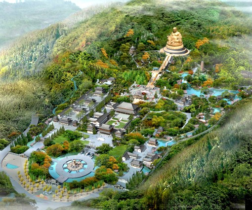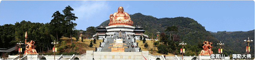 雪竇山景區雪竇山以雪竇古刹、千丈岩瀑布為中心,東起入山亭,北連乳峰顛,西接徐鳧岩,南臨亭下湖。天王殿內後面是“彌勒寶殿”,正中是彌勒化身布袋和尚塑像,兩邊是千尊形態不同的彌勒,背景是佛教的五大名山、五大道場,即山西五臺山文殊道場,四川峨眉山普賢道場、浙江普陀山觀音道場、安徽九華山地藏道場和奉化雪竇山的彌勒道場。雪竇山露天彌勒大佛位雪竇後山海拔369公尺的山坡上,露天彌勒大佛通高56.74公尺,佛身高33公尺,採用錫青銅打造。